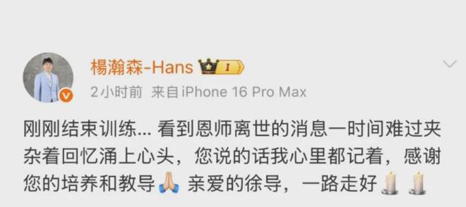 对于徐长锁指导的突然去世,杨瀚森也是很意外,他更新个人社媒表达了悲伤的情绪:“刚刚结束训练...看到恩师离世的消息,一时间难过夹杂着回忆涌上心头,您说的话我心里都记着,感谢您的培养和教导。亲爱的徐导,一路走好️️。”