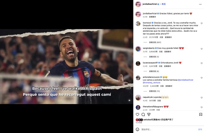 梅西在社媒中评论到,“谢谢你,乔迪(阿尔巴)。我会非常想念你的。在一起经历了这么多事情之后,如果我看向左边却没有看到你,我会感觉很奇怪。这些年来你给了我多少助攻,真是不可思议。现在谁会从身后给我传球呢?”